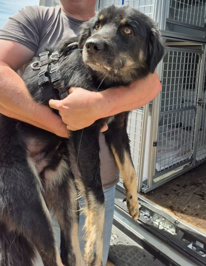 Beim seinem Anblick stockte uns der Atem. Es kam ein hübscher, dürrer und zutiefst verängstigter Hund zum Vorschein, der mit allem, was er hatte, dagegen ankämpfte, heraus geholt zu werden. Ein kräftiger Mann schaffte es nach mehreren Minuten. Unsere Idee, ihm erst die Gelegenheit zu geben, auf seinen Beinen zu stehen und sich eventuell zu erleichtern, wurde abgelehnt. So saß er zitternd und apathisch in unserem Auto und wir wurden mit den Worten „viel streicheln, viel Liebe, morgen früh ist alles gut“ verabschiedet.