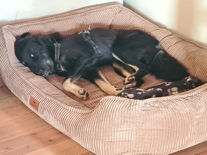 Im Haus bugsierten wir Dolcetto in sein Hundebett, wo er ab diesem Zeitpunkt apathisch lag und sich nicht mehr bewegte…, drei Tage lang!